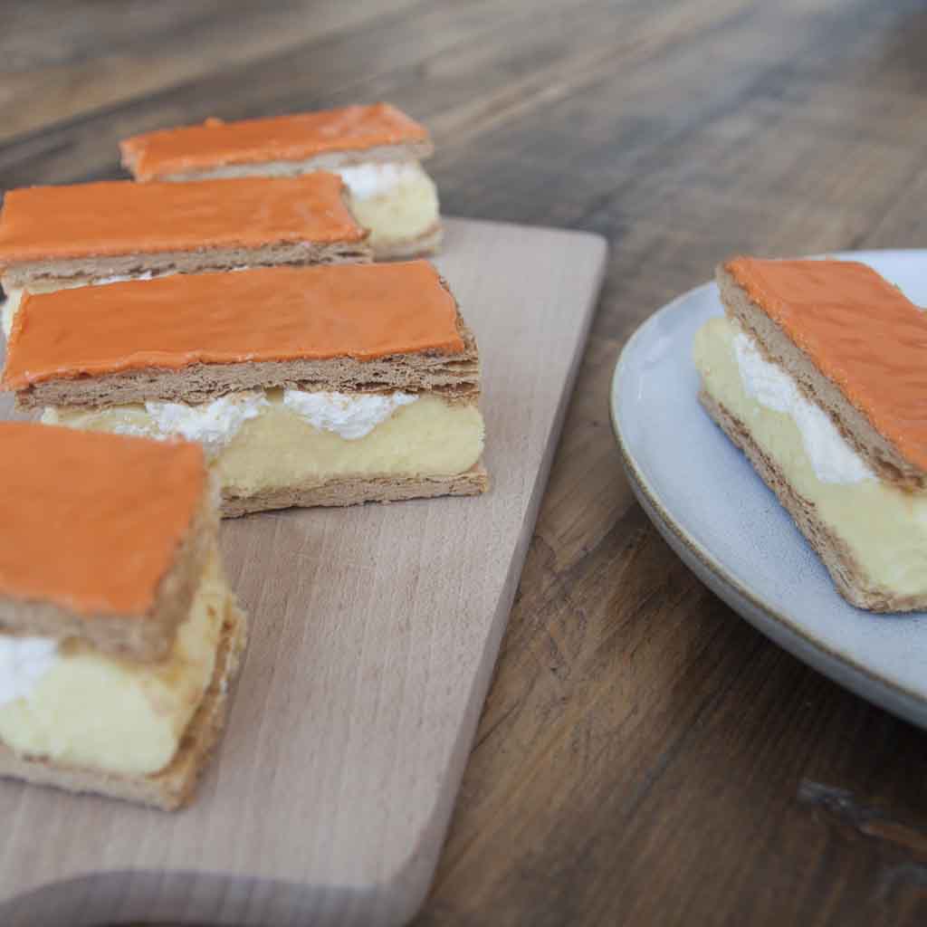 Met de heerlijke oranje tompoucen wordt ieder feest koninklijk! Knapperige onderkant met echte bakkersroom gemaakt volgens geheim recept. Natuurlijk ook met echte slagroom ertussen. Afgemaakt met knapperige bovenkant met heerlijke laag oranje fondant.