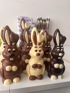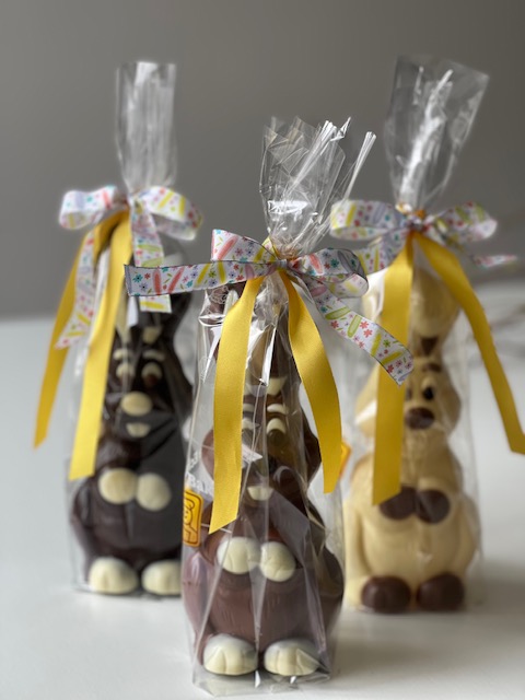 Deze vrolijke lachhaas is er in melk, wit en pure chocolade en zit in een mooie geschenk verpakking.
