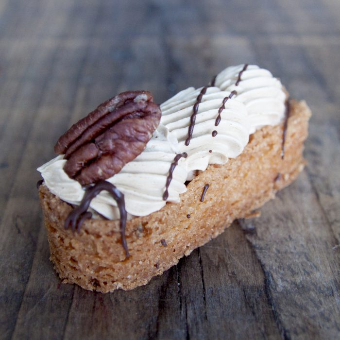 Slofje van stevige bodem met romige karamel bavaroise afgemaakt met de heerlijke bite van een pecannoot